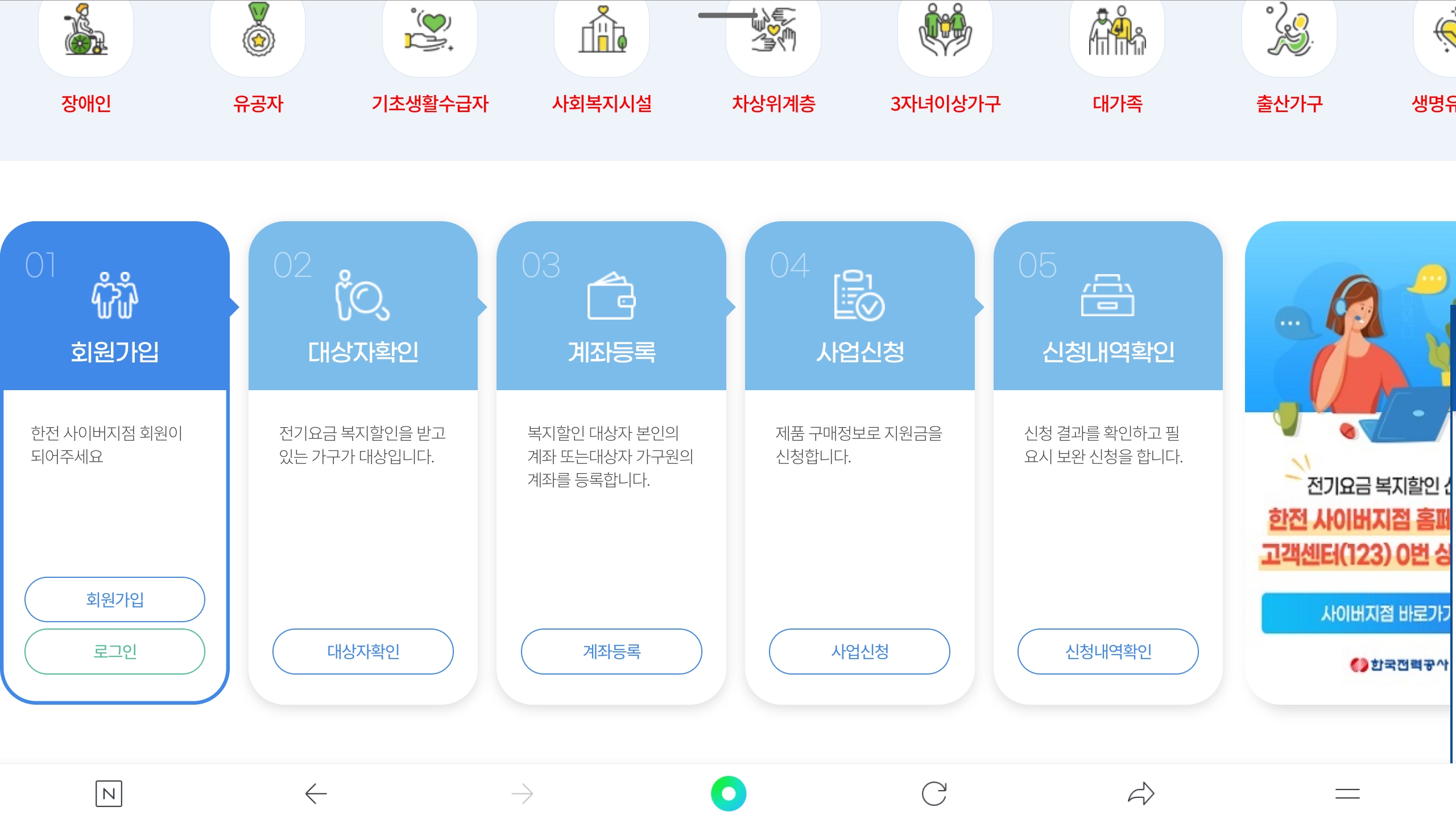한전 사이버지점 회원가입 후 지원사업 신청 가능한 대상자인지 확인하시고